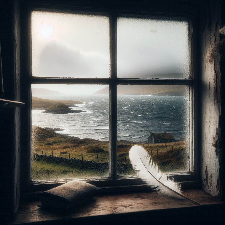 I tried the window, but it wouldn’t budge. Painted shut. The room was stale. There was a scent swirling amongst the dust motes that I couldn’t quite pin down, feathers, old pillows. Whatever it was, it wasn’t pleasant. I peered out at the darkening sky, clouds where creeping in, soon I wouldn’t be able to see the hills across the water.