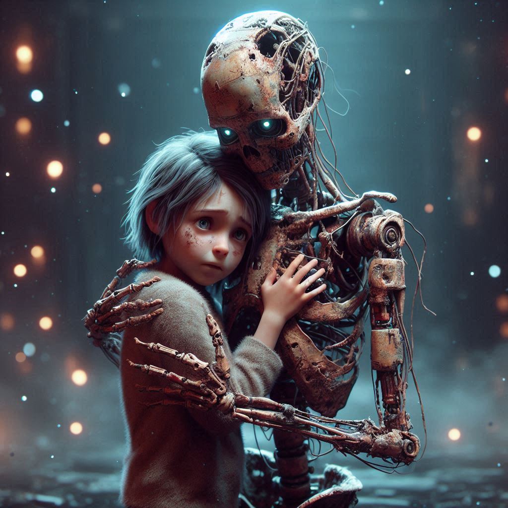 The child who has just thrown herself like a shield over a rotting synth causes me to pause. Forces me to see her. She lies draped upon the cowering machine and she glares at me. She’s scared, but defiant. I shift my rifle, making sure she can see its aimed at her. She takes a jagged breath but doesn’t move.